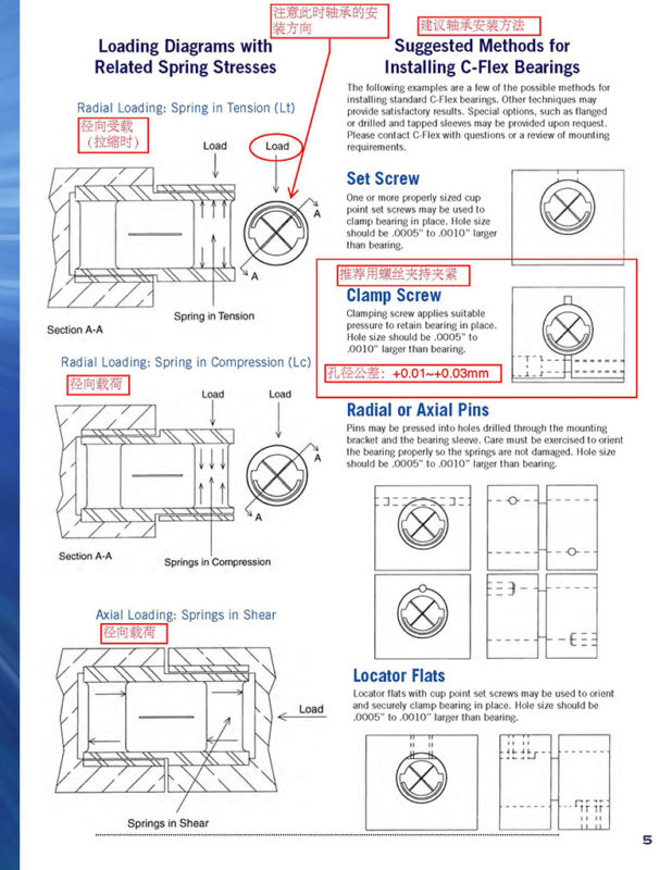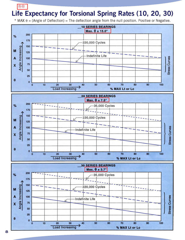 负载能力:Lt或Lc(拉伸或压缩时的磅负载)这些值是零偏转时的最大负载(重量或静态力)。 调整轴承尺寸时,必须考虑负载要求,角偏转和循环寿命。 请参阅预期寿命曲线或联系C-Flex寻求帮助。 Lc是纯径向载荷,在弹簧中产生压应力,而Lt是产生拉应力的纯径向载荷。