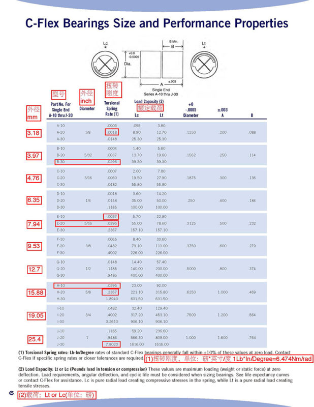 扭转弹簧刚度:在零负载下,标准C-Flex轴承的Lb * In / Degree率一般在这些值的+/- 10%以内。 如果需要特定的弹簧刚度或更小的公差,请联系C-Flex或利世达科技。